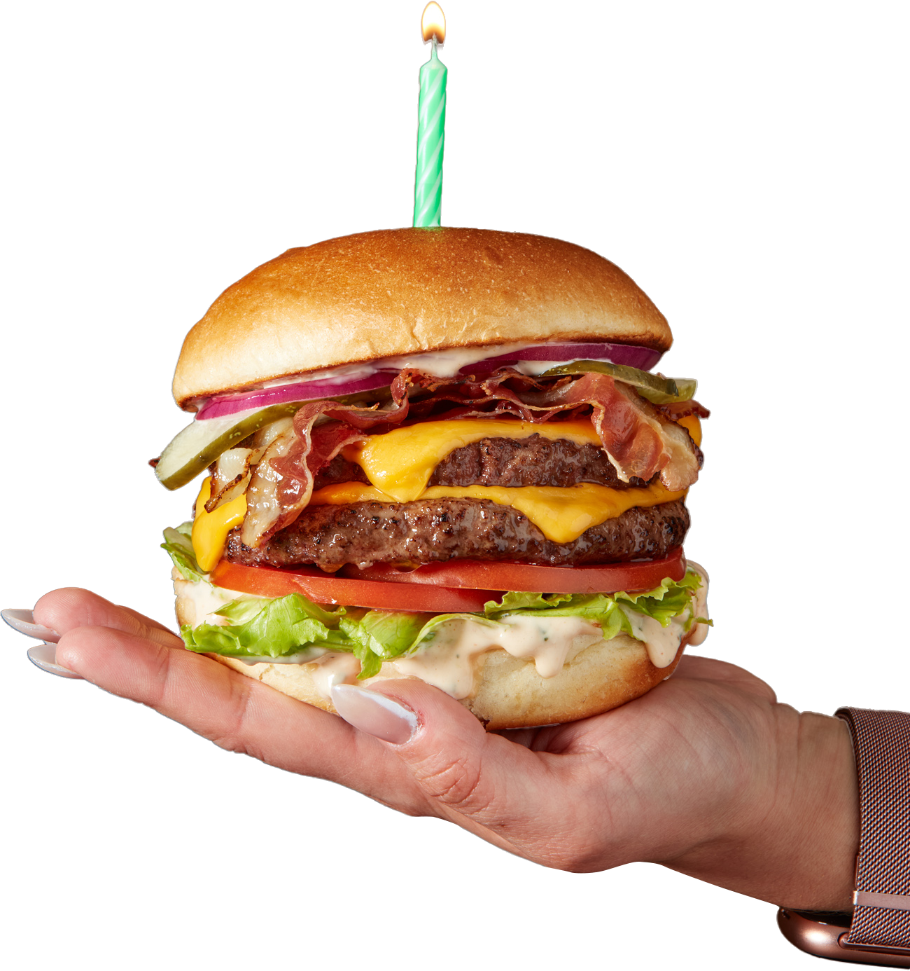 Crispy Bacon, American Cheddar, Lettuce, Tomatoes, Onions, Pickles, Signature Sauce, and choose from over 30+ toppings to make your own creation.