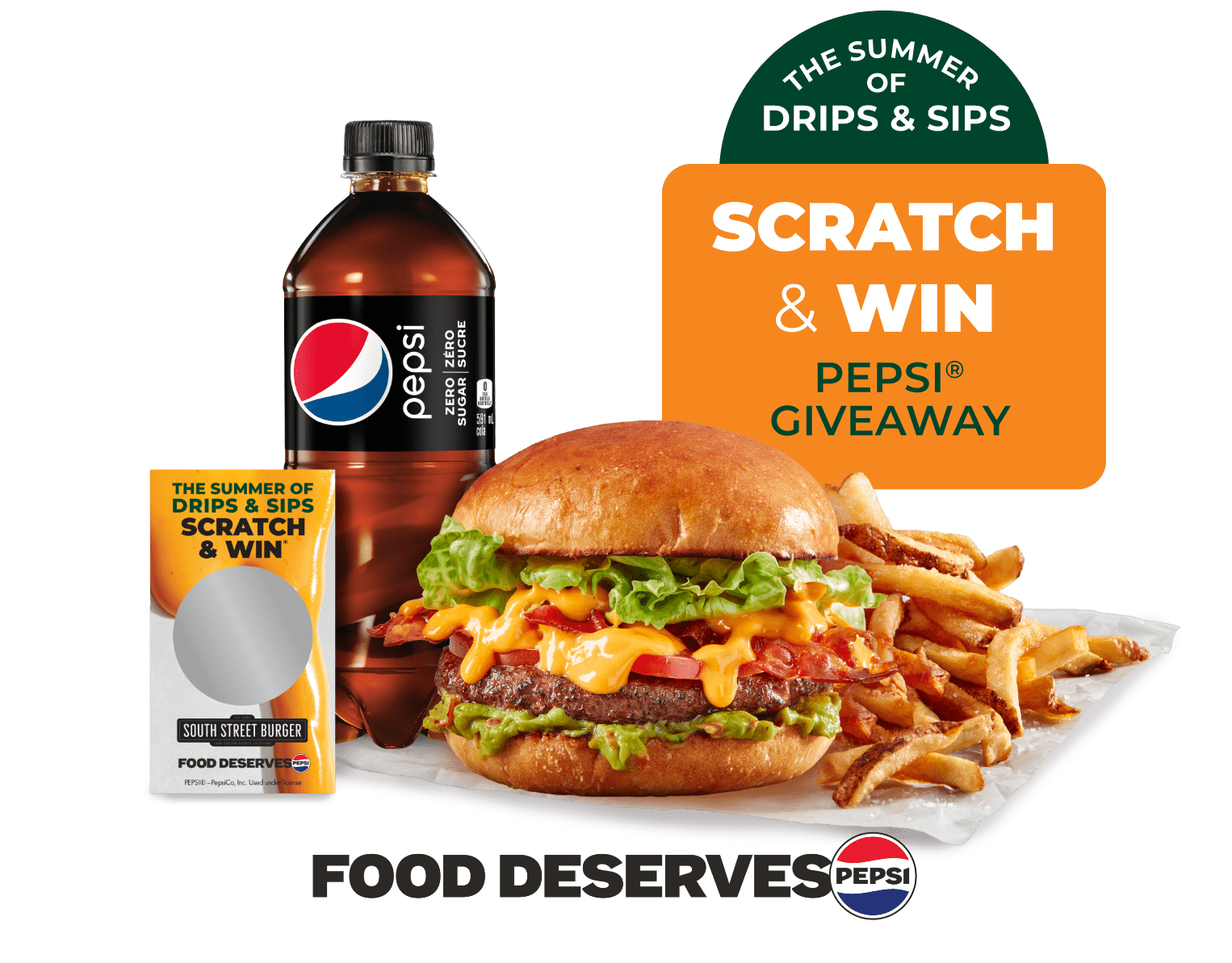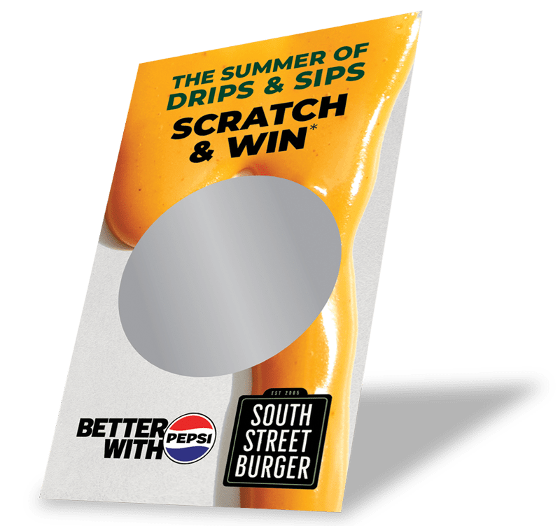 Entry – Purchase one (1) participating South Street Burger Limited Time Offer meal (Queso Crunch Burger or Queso Bacon Burger) and upgrade your combo with any 591ml bottled Pepsi ® product to receive a scratch card (the “Scratch Card(s)”).